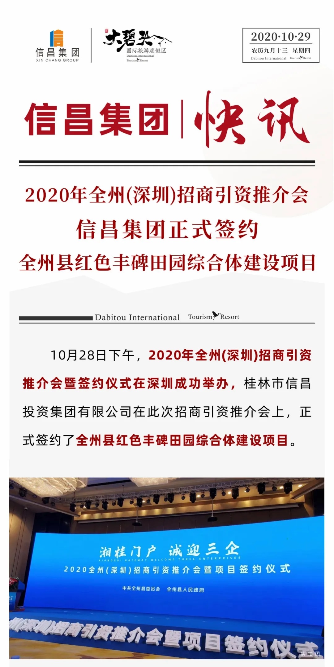 【大碧頭快訊】2020年全州(深圳)招商引資推介會上,信昌集團(tuán)正式簽約全州縣紅色豐碑田園綜合體建設(shè)項目