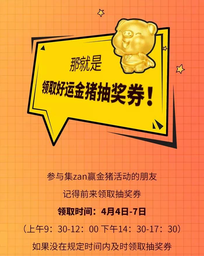溫馨提示!4月4日-7日前來領(lǐng)取好運(yùn)金豬抽獎(jiǎng)券,周大福好運(yùn)金豬帶回家!